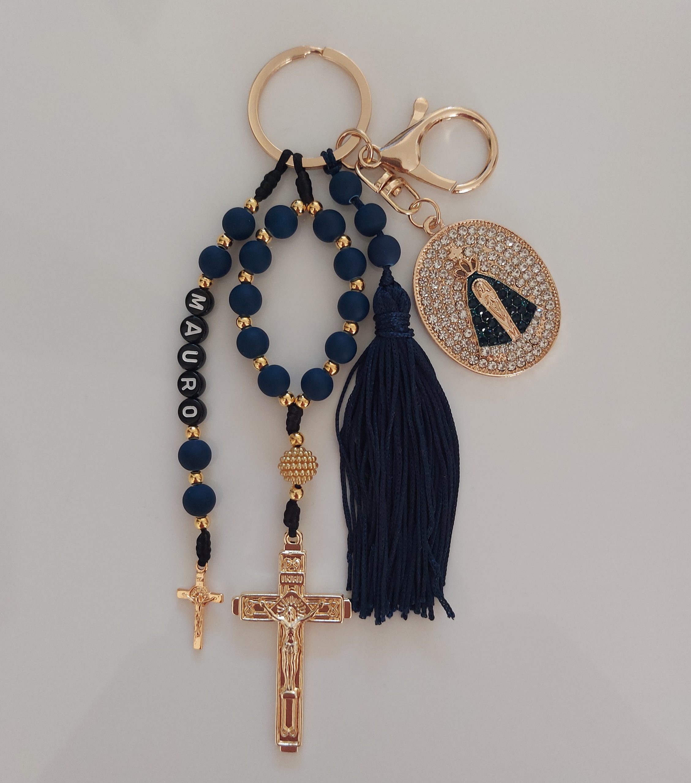 Chaveiro mosquetao com medalha de Nossa Senhora Aparecida, desena e tassel