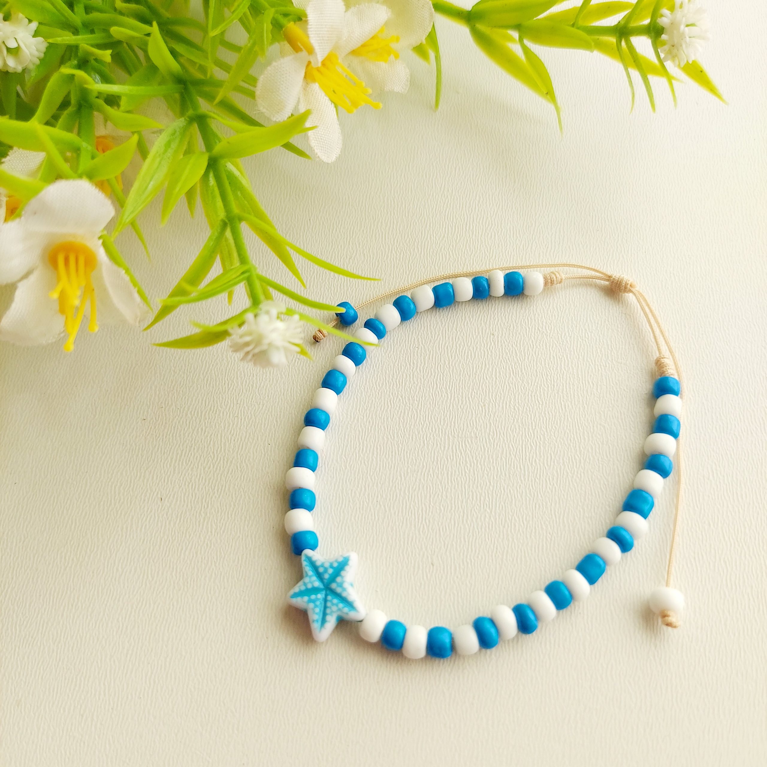 Pulseira duas cores com estrela, contas de vidro e fecho com amarração regulável aproximadamente 12cm