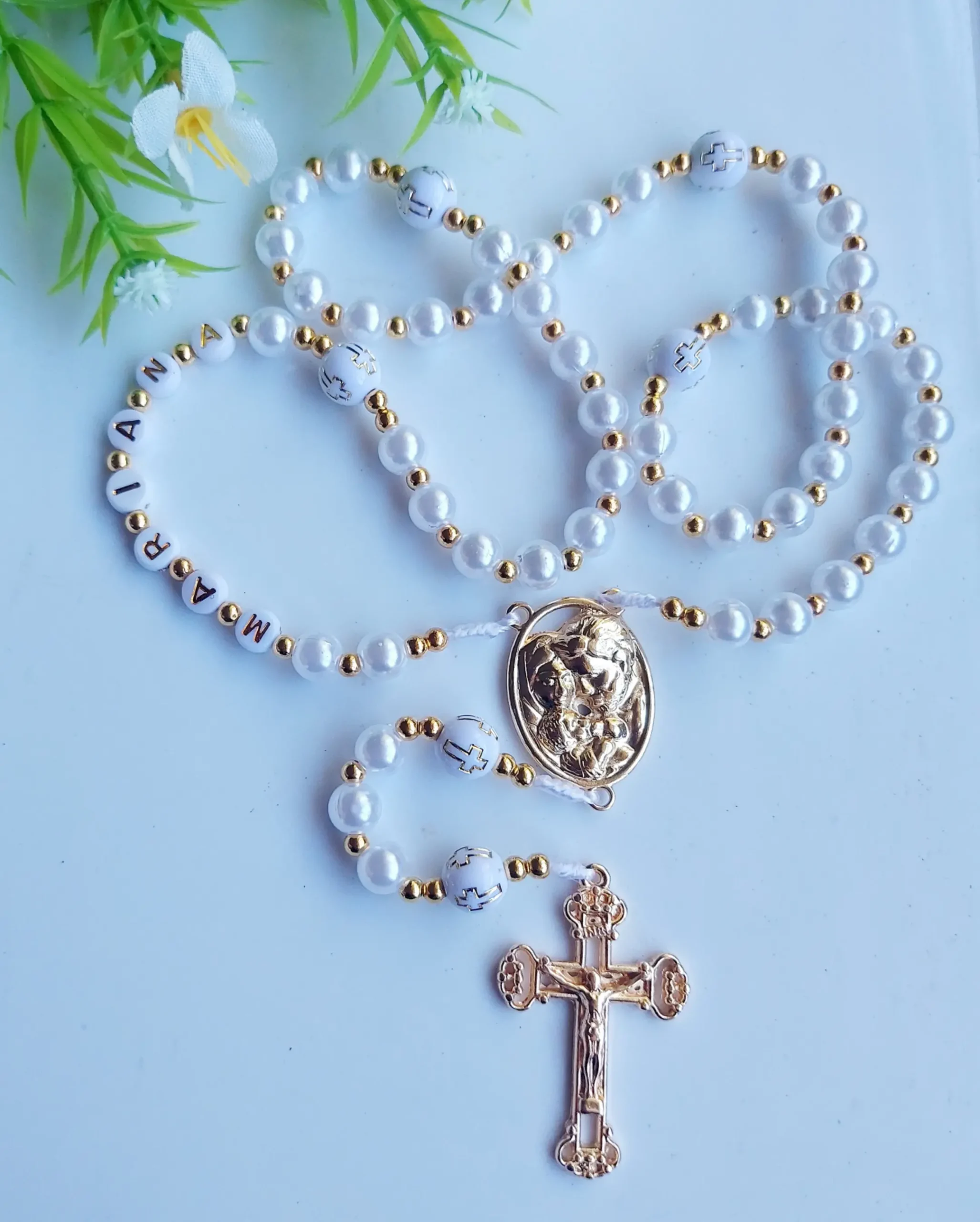 Terço Sagrada familia de perolas abs com separadores em toda extensão personalizavel com nome